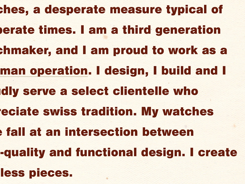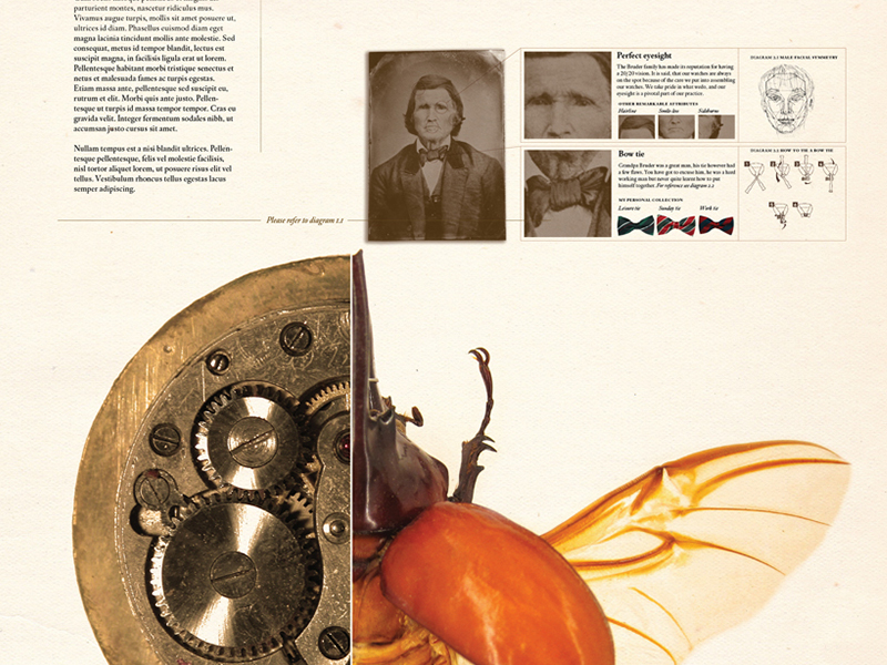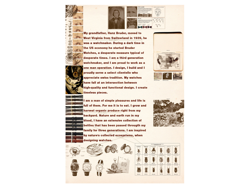 In this study I developed an alternative persona for myself, one that amplifies, undermines, and rediscovers elements of who I am as a designer and where I want to be. Mr. Hanz Bruder, my alter ego, is a third generation swiss watchmaker who collects beetles. After creating a biographical diagram, I produced a new work of design in the mode of Mr. Bruder. In this exercise graphic design becomes a visual performance and as so, the design pieces are a manifestation of a different designer as well as his dialogue with design as a discipline.