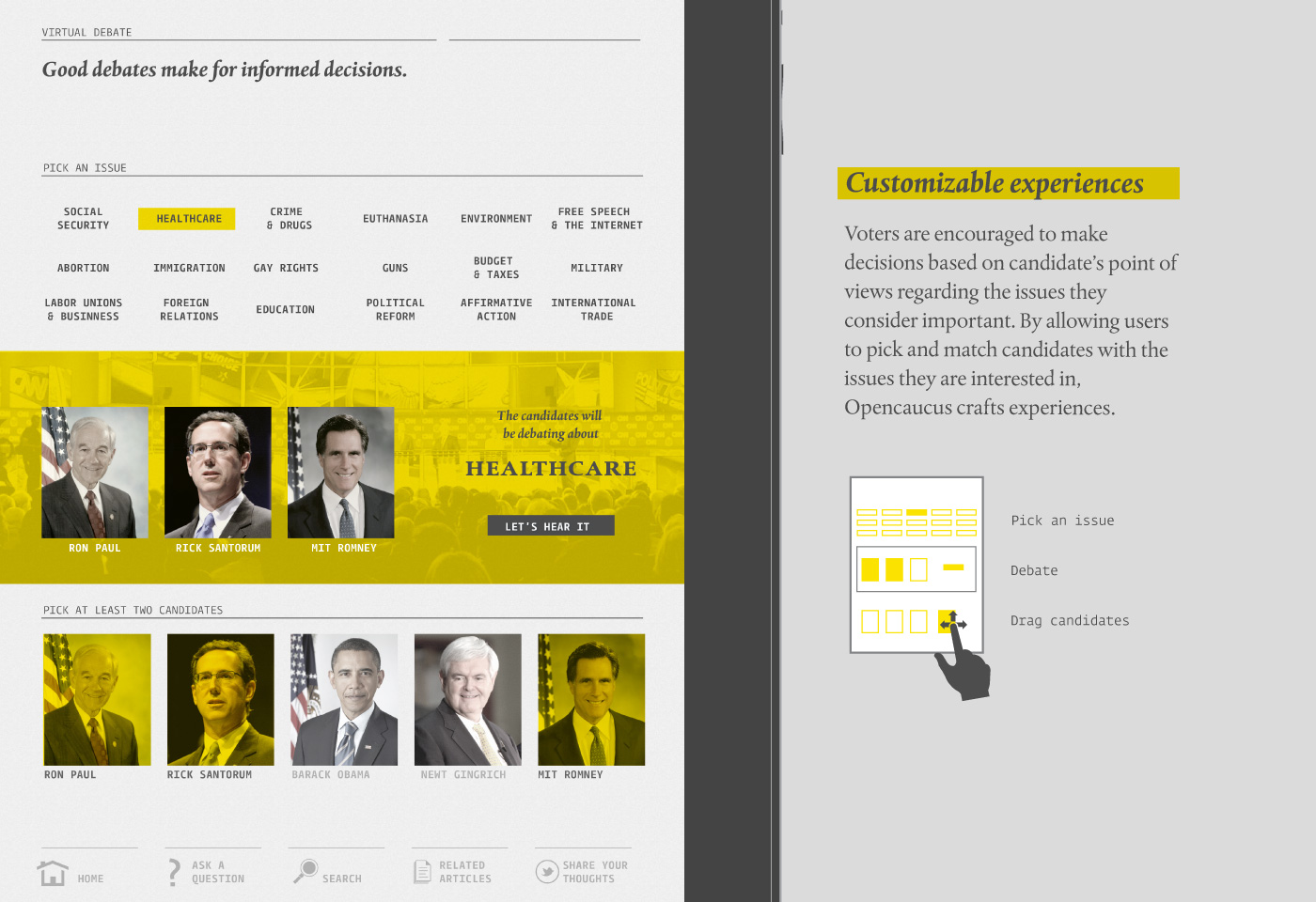 Open Caucus is a politically independent non-partisan app that keeps young voters informed and involved with elections. Open Caucus allows for in-depth analysis of economic, social, cultural and political issues and connects voters with relevant information about them.