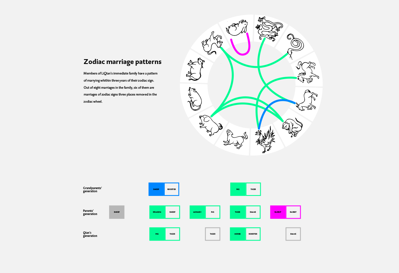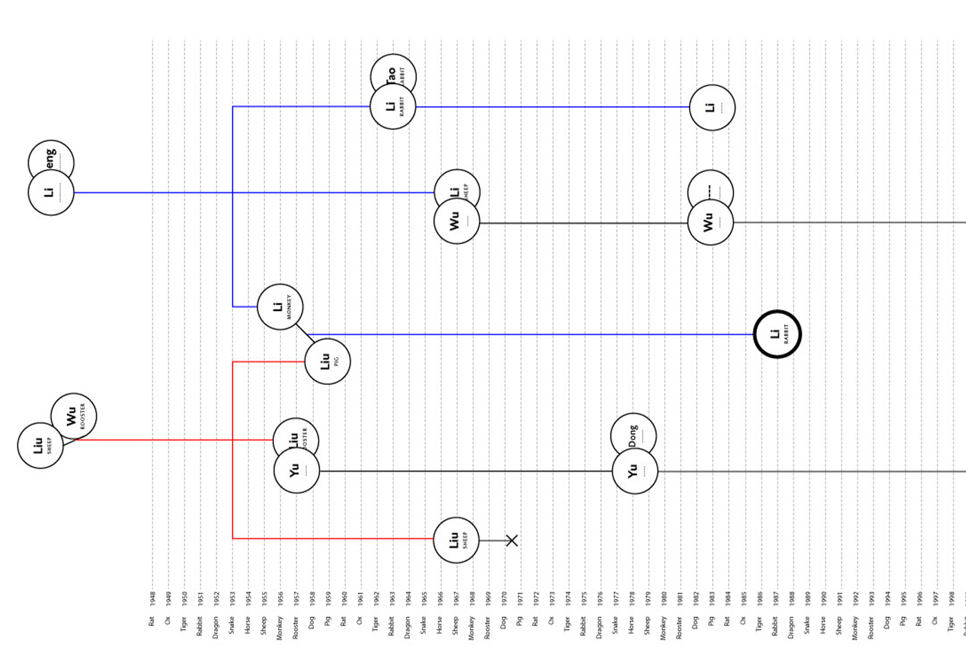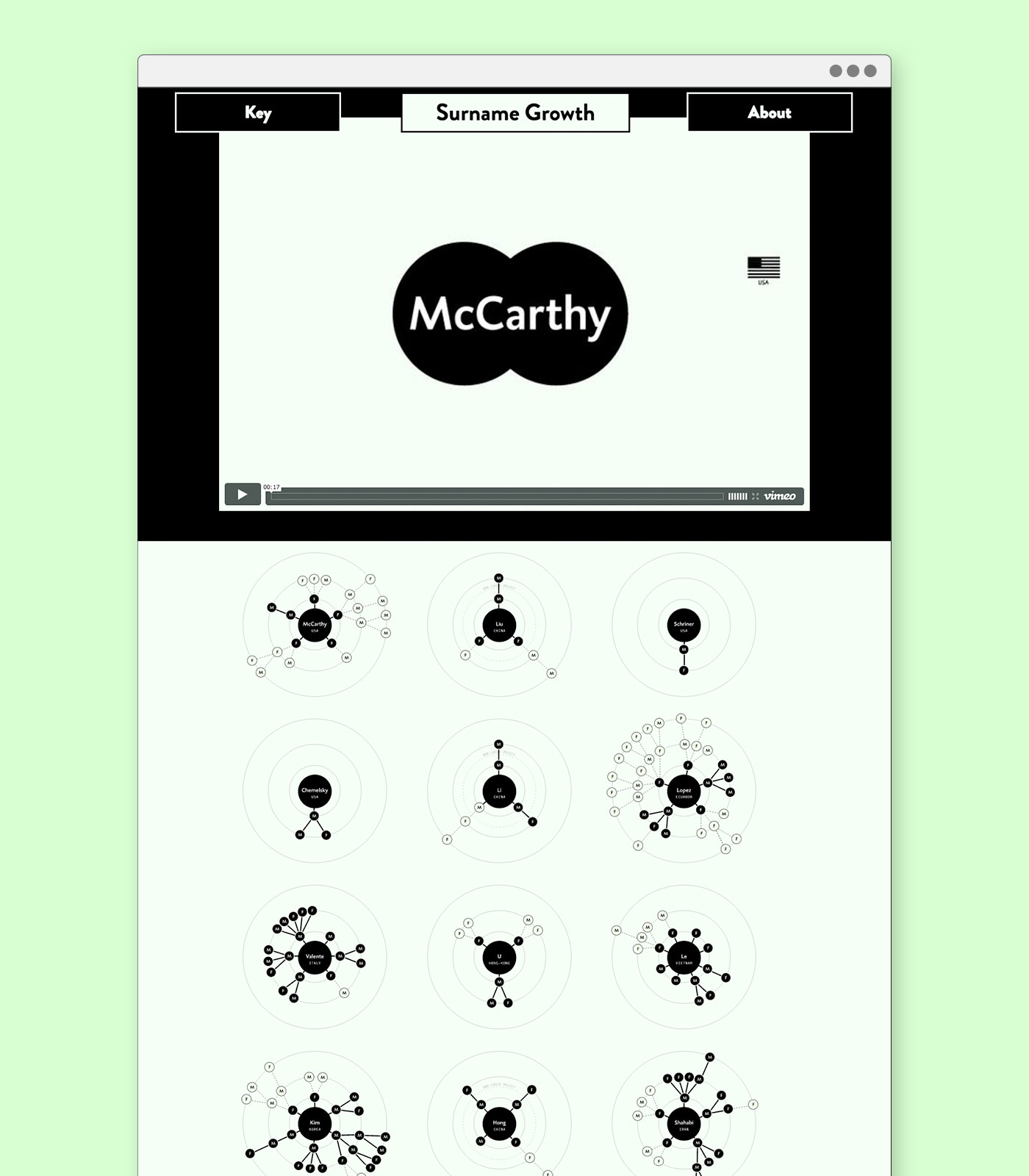 By comparing different families from around the world to Chinese families, this visualization points the effect of said policy. In contrast with western contemporary families' organic growth, their Chinese counterparts are symmetric, reducing the chance for a surname to be passed on.